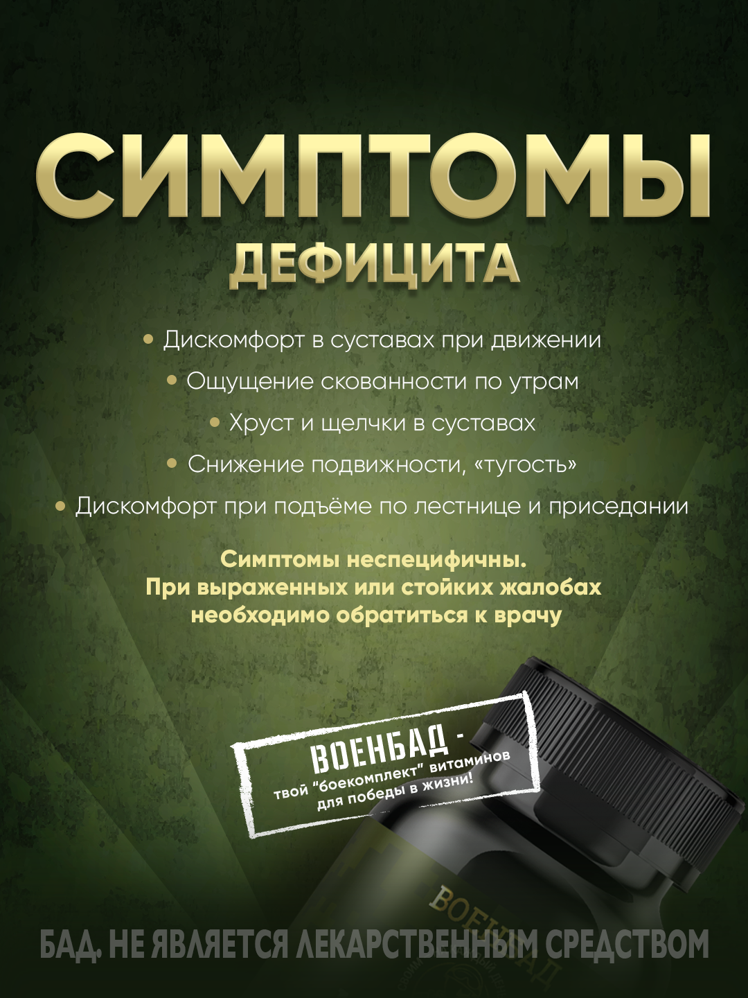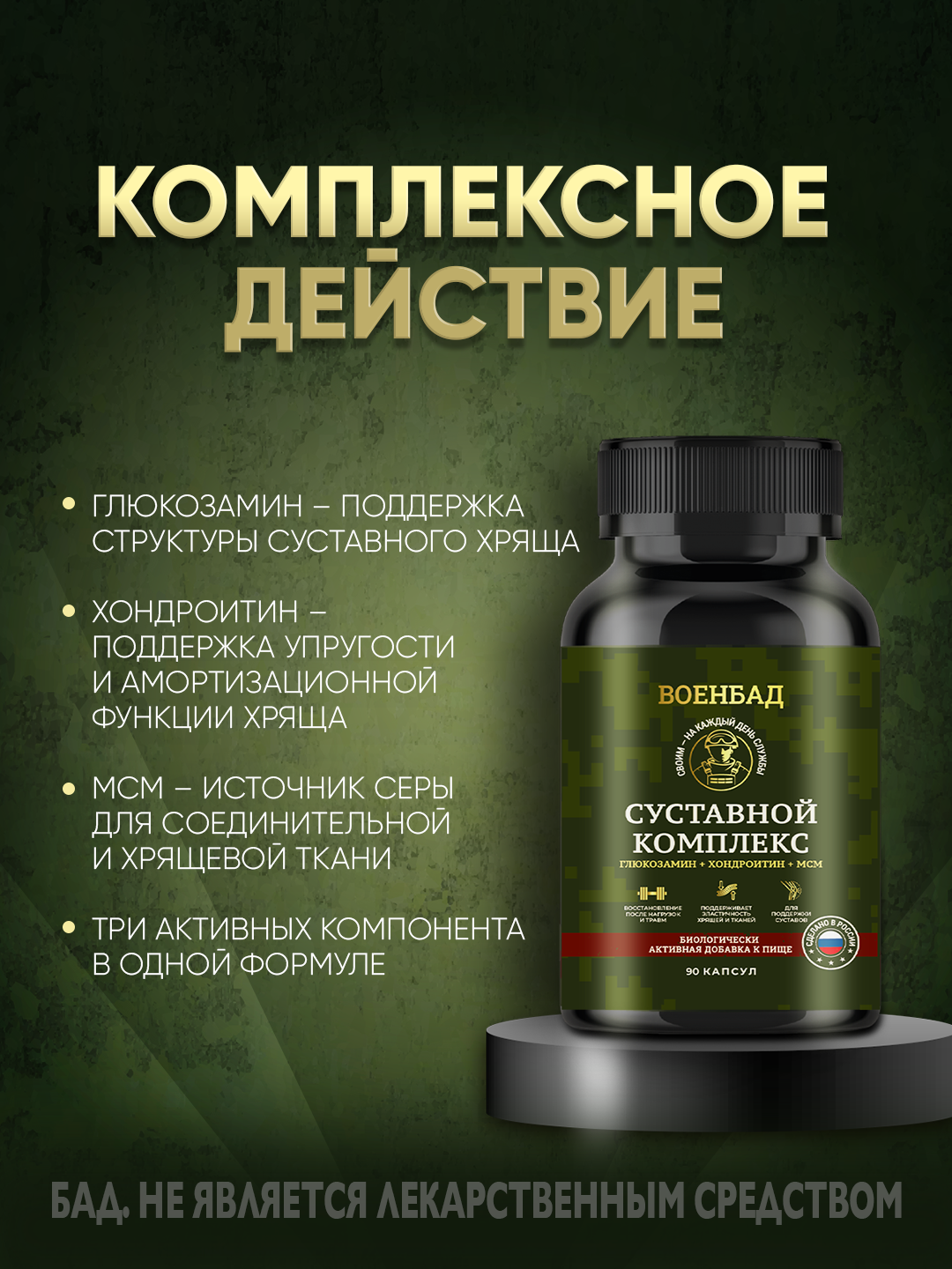 Биологически активная добавка к пище «Глюкозамин + хондроитин + МСМ» — комплекс для поддержки суставов, связок и хрящевой ткани. Формула сочетает три ключевых компонента: глюкозамин, хондроитин сульфат и метилсульфонилметан (MSM), которые являются дополнительными источниками веществ, необходимых для нормального функционирования опорно-двигательного аппарата.